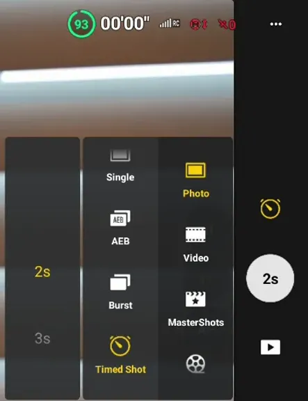 DJI Fly app Timed Shot menu with 2 second interval selected and Photo mode